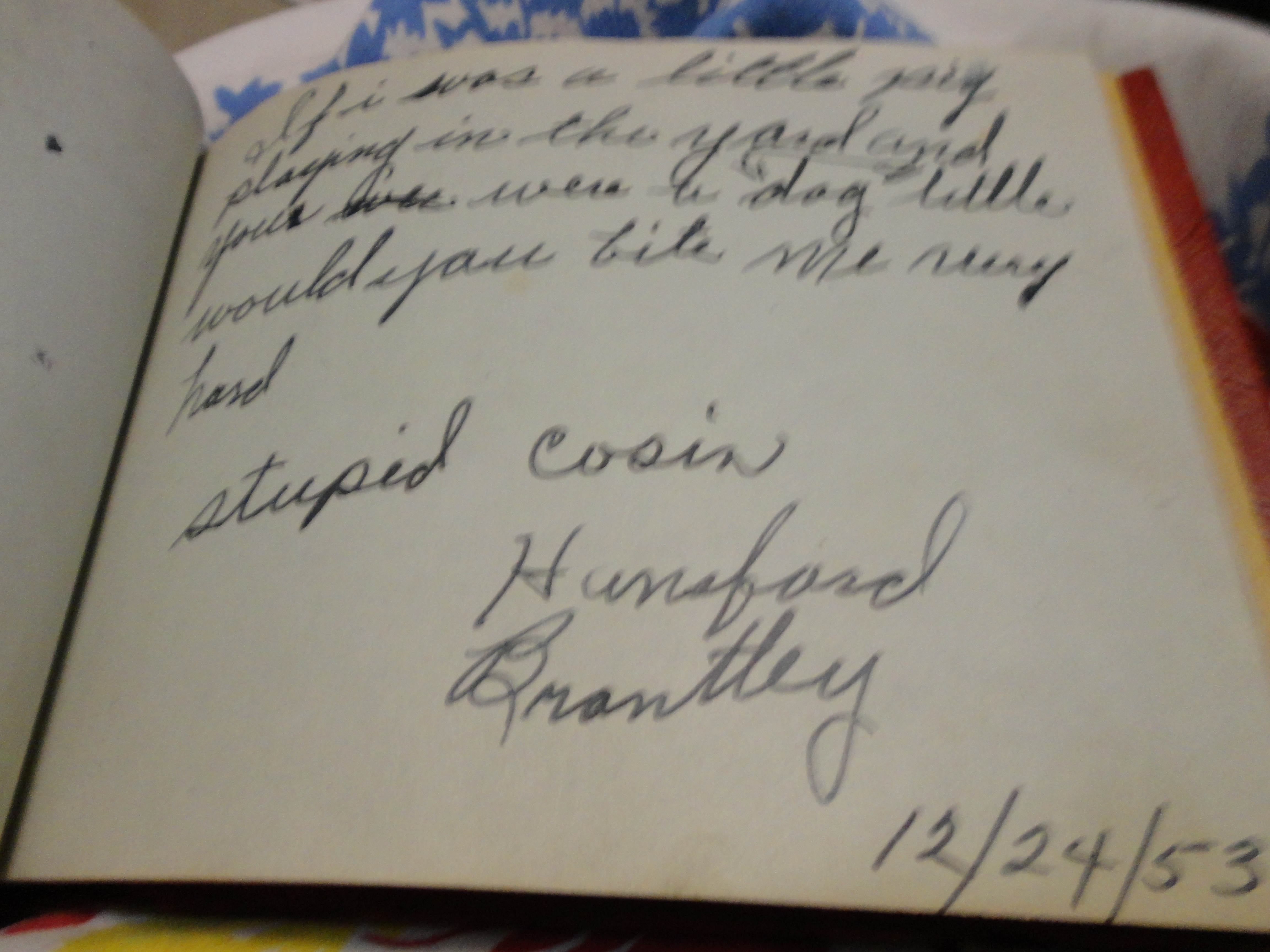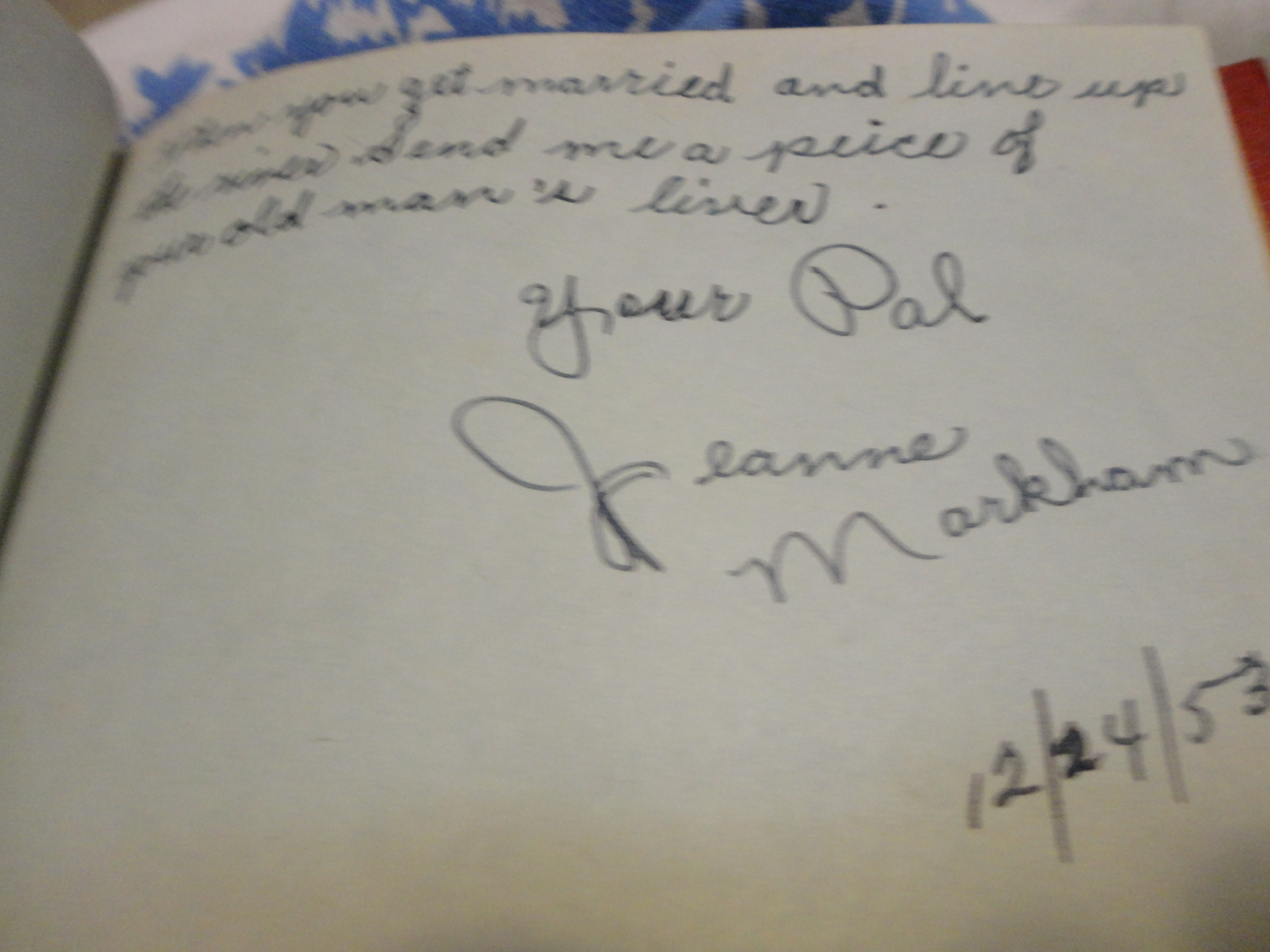 I was looking for a certain book of poetry in my shelves and found my mom’s old autograph book from when she was in junior high, 1953-55. Here are some of the quite poetic inscriptions inside:
