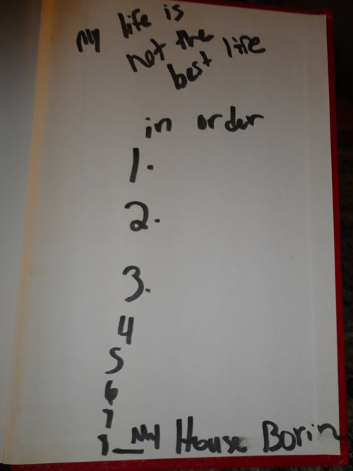 I picked up a really bad book of poetry the other day called Our Own United States in Verse, which some child had written and drawn on. On the inside back cover she (I’m guessing a she) started a list: “My life is not the best life.” Then she started a numbered list from 1-8, with all items being blank except 8, which says, “My house boring.”