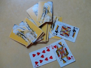I will be scattering rompoetry love cards . . . well, rompoetry cards, vintage–this deck has a wonderful picture of a Native American chief on it. On the other side are . . . words, a phrase, something for you to think about. Collect several and make your own poem.