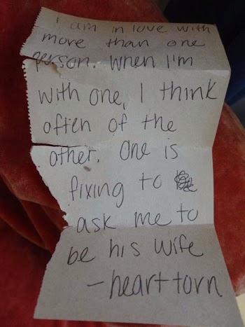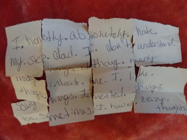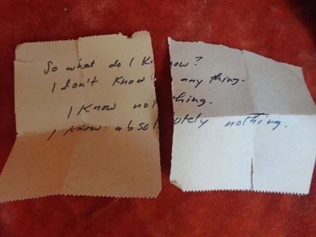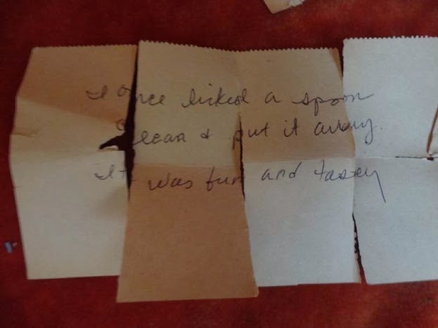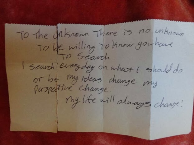 The box has a poem by Denise Levertov on it. This summer I didn’t have any ROMP events and dirtdobbers made a nest in the box. I recently took the mud nest out and noticed all the secrets were crumbling. That is as it should be . . . the paper available to write on is from an old notebook. But before they totally crumbled away, I took photos of them. I didn’t photograph the ones that had names on them.