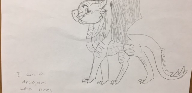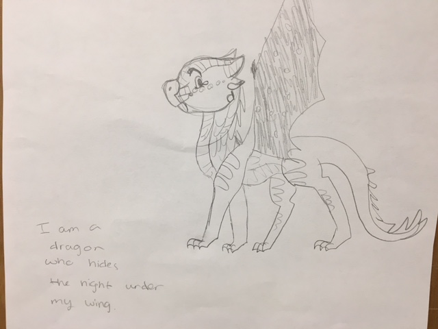 One girl wrote no words but drew a lovely dragon-type creature for me. I wrote on it, “This is lovely, and I would really like to see some of your words to go with it.” The next day, she added these words to it, “I am a dragon who hides the night under my wing.”