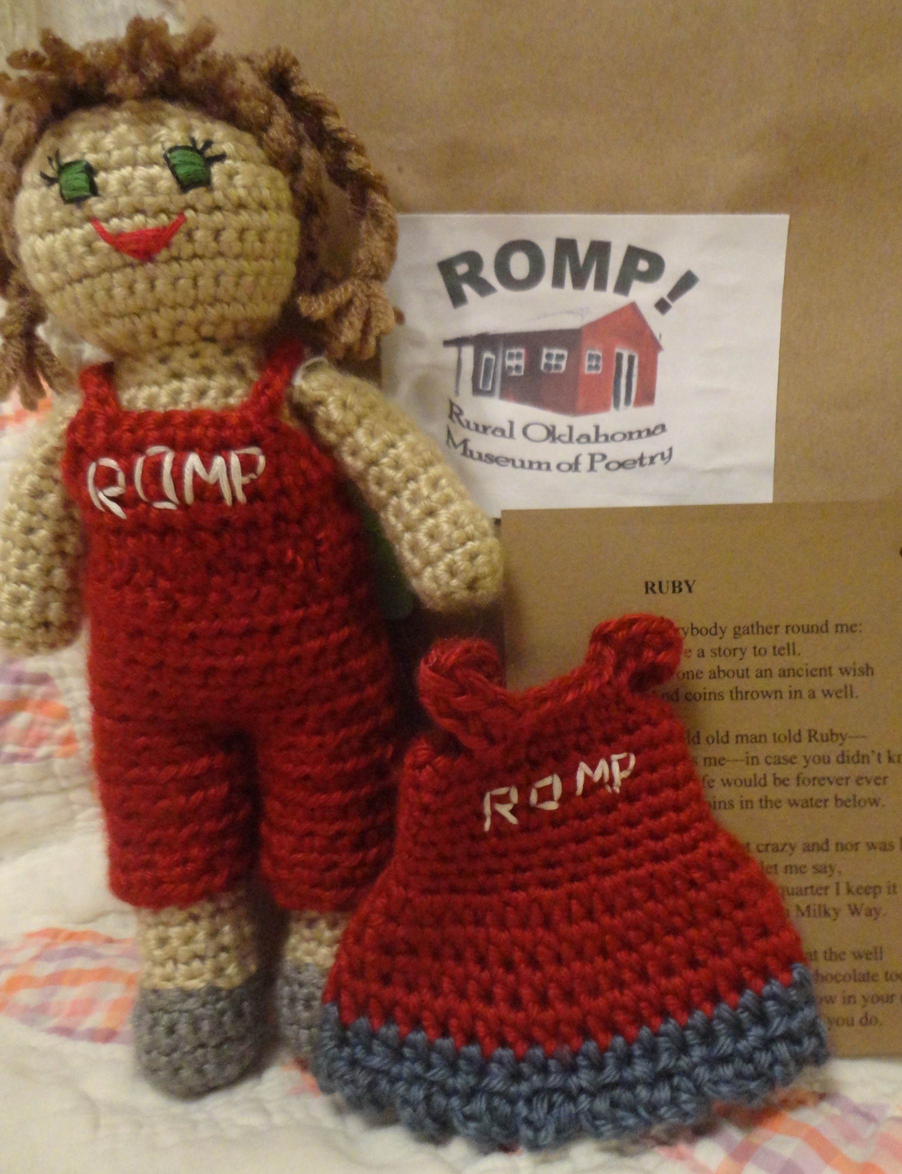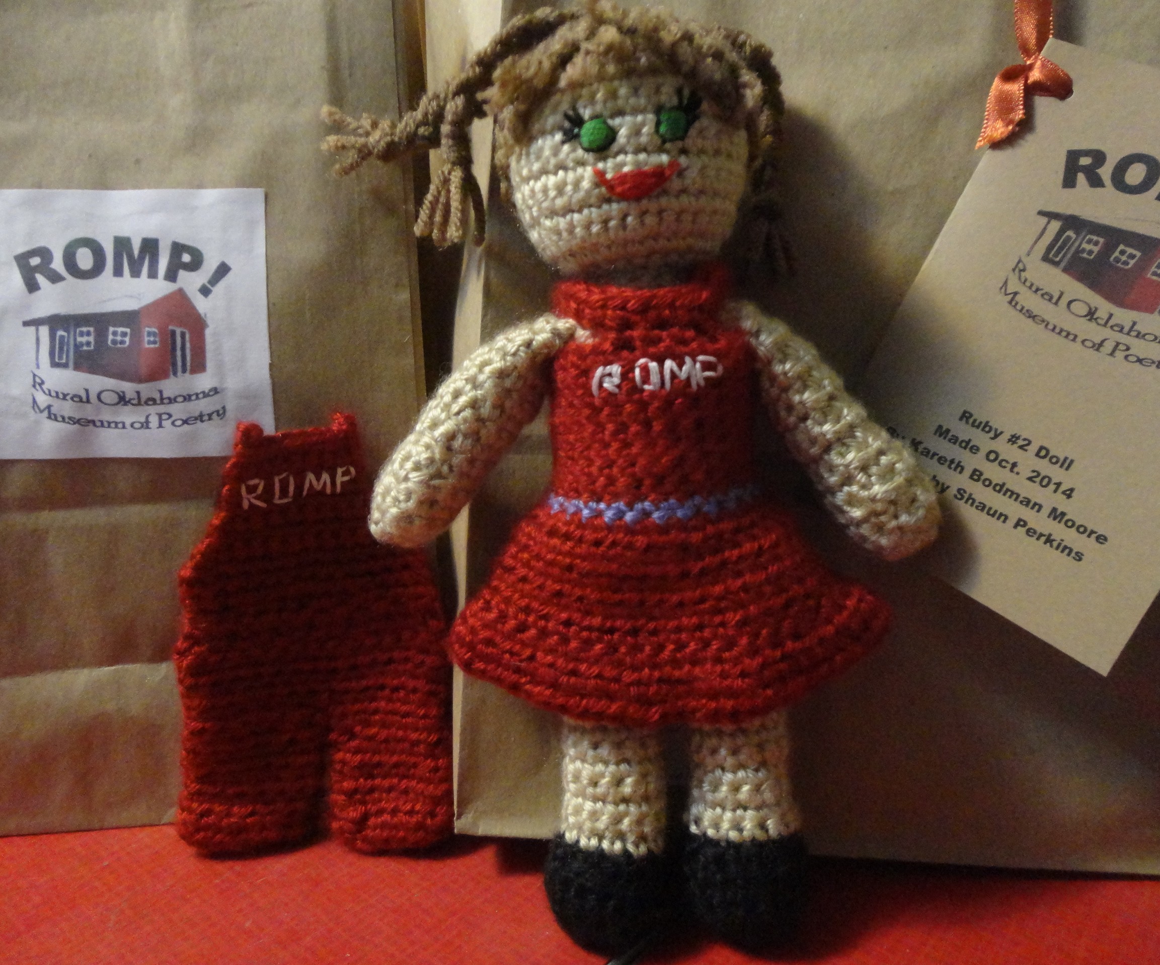 Ruby2-5Ruby, the ROMP Mascot, is a handmade doll that comes in 3 sizes and is made by local storyteller and crafter Kareth Bodman Moore. All proceeds from the sale of the Ruby dolls go to the crafter and to our nonprofit 501(c)3 museum. Each unique, no-2-alike Ruby doll comes with the following: