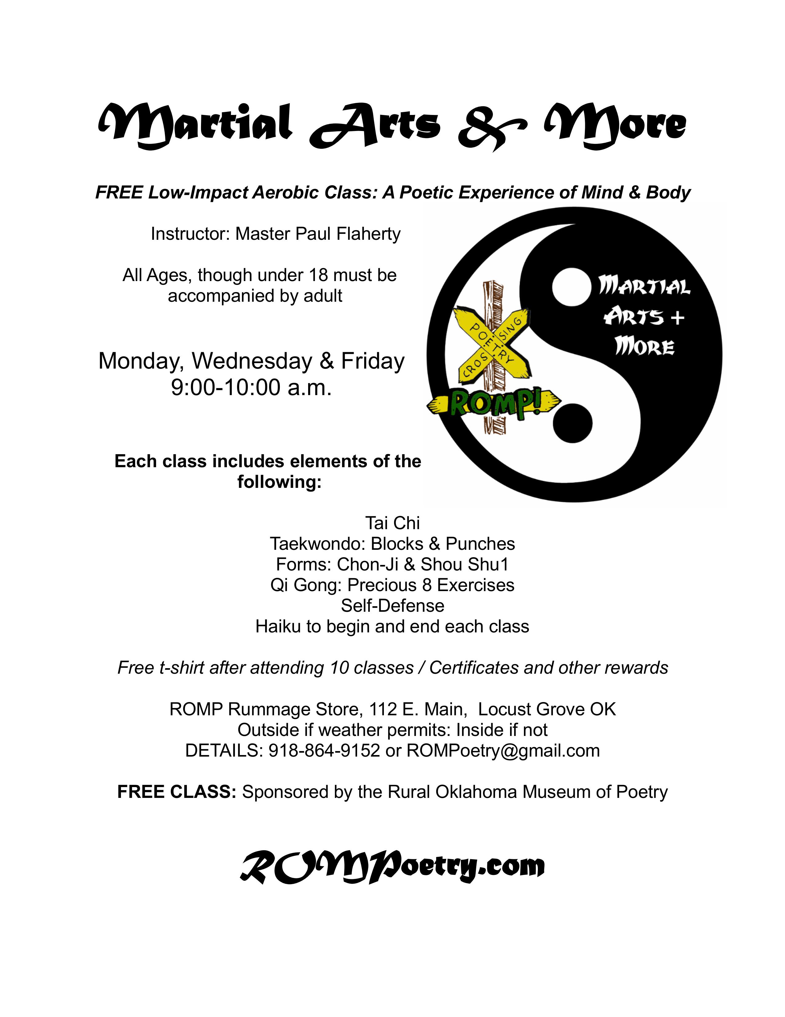 This ongoing class meets three times a week in Locust Grove. It is a low-impact full-body workout with stretching, breathing exercises, self-defense moves and forms. There is also a poetry component! There is no fighting or sparring. Everything is non-contact.