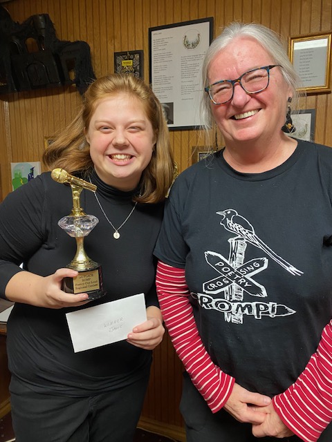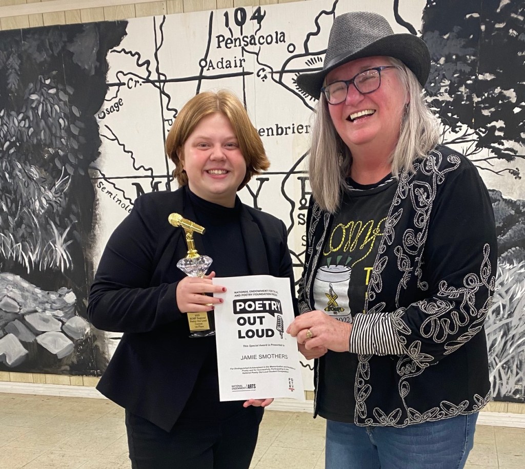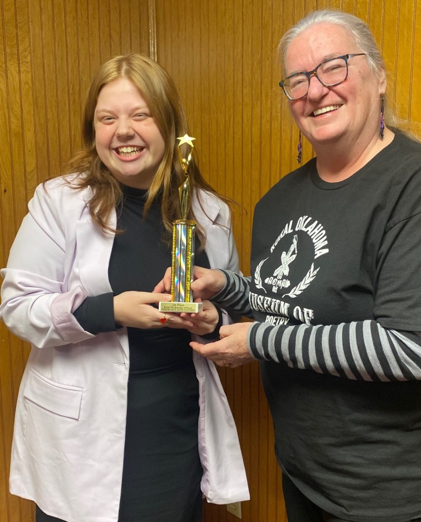 The 2025 winner was Jamie Smothers! The 2nd place winner was Avery Wright, and 3rd place was Avery Collier. All three students are from Oologah High School. The winners received trophies and all participants received a poetry bracelet. Jamie also received $100 to defray expenses for the regional contest at Edmond. Their teacher Jennifer Denslow was awarded $100 as a poetry ambassador.