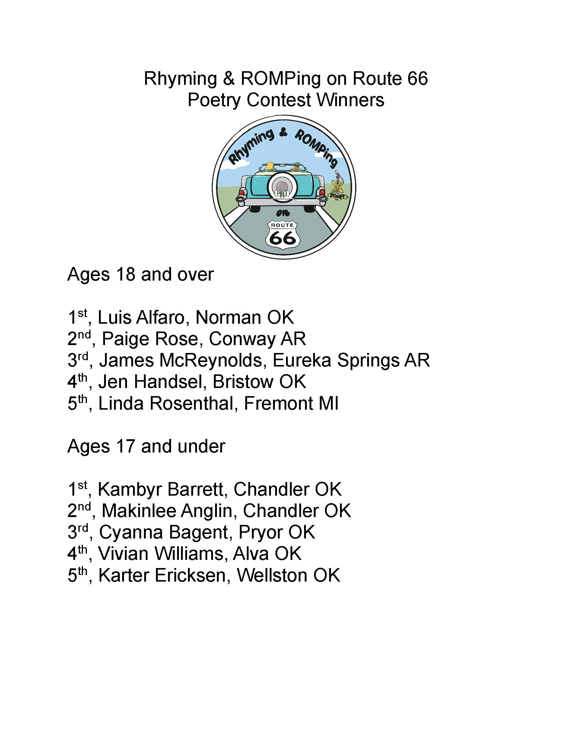 Noon-1:00: Presentation of Route 66 Poem Contest Awards