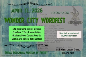Wonder City Wordfest is an annual celebration of poetry and community that began in 2014 as the Rural Oklahoma Museum of Poetry’s ROMPfest. The day includes a variety of ways for people of all ages to stretch their creativity and be inspired by the beauty, joy and value of words, poetry, and community.