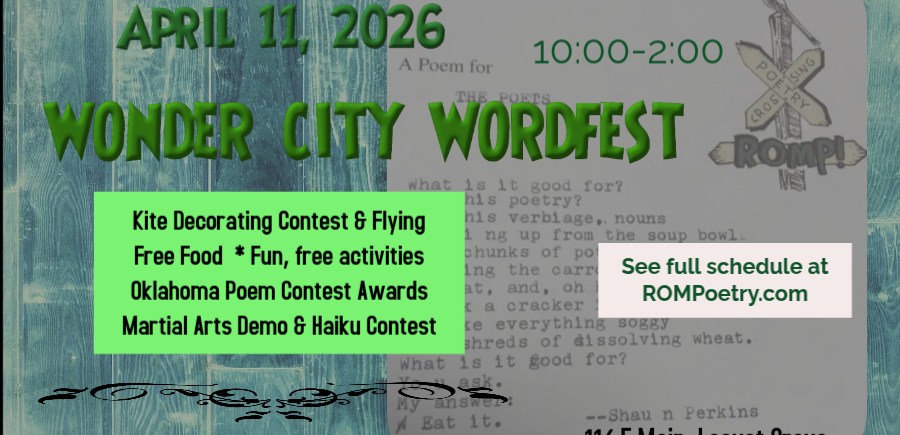 Wonder City Wordfest is an annual celebration of poetry and community that began in 2014 as the Rural Oklahoma Museum of Poetry’s ROMPfest. The day includes a variety of ways for people of all ages to stretch their creativity and be inspired by the beauty, joy and value of words, poetry, and community.